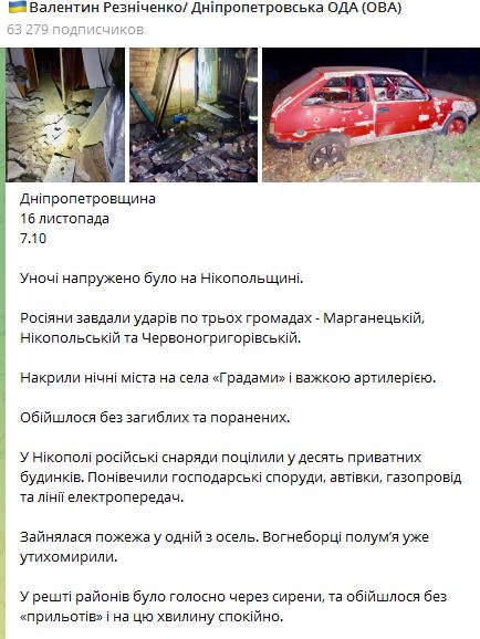 Обошлось без погибших и раненых. В Никополе российские снаряды попали в десять частных домов. Также повреждены хозяйственные постройки, автомобили, газопровод и линии электропередач.
