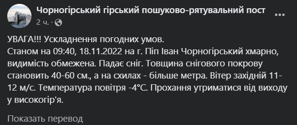 "По состоянию на 09:40 на горе Поп Иван Черногорский облачно, видимость ограничена. Падает снег. Толщина снежного покрова составляет 40-60 см, а на склонах - более метра. Ветер западный 11-12 м/с 4 ° С. Просьба воздержаться от выхода в высокогорье", - говорится в сообщении.
