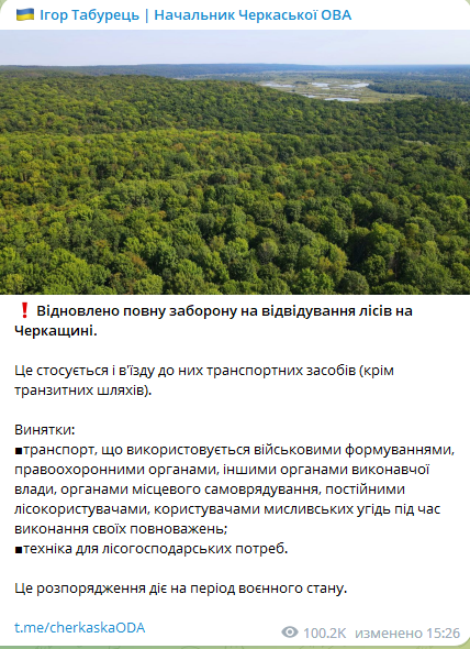 "Восстановлен полный запрет на посещение лесов Черкасской области. Это касается и въезда в них транспортных средств (кроме транзитных путей)", - написал Табурец.