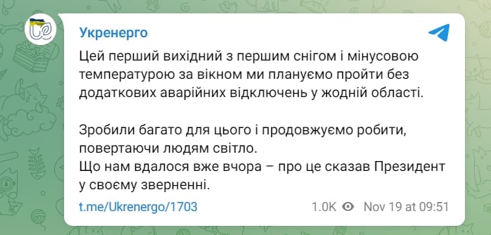 Об этом сообщает Укрэнерго в телеграм-канале.