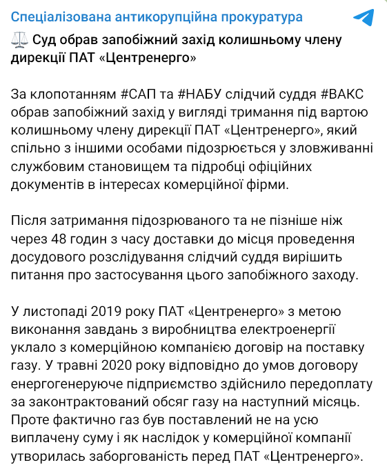 "По ходатайству САП и НАБУ ВАКС избрал меру пресечения в виде содержания под стражей бывшему члену дирекции ПАО "Центрэнерго", который совместно с другими лицами подозревается в злоупотреблении служебным положением и подделке официальных документов в интересах коммерческой фирмы", - говорится в сообщении.