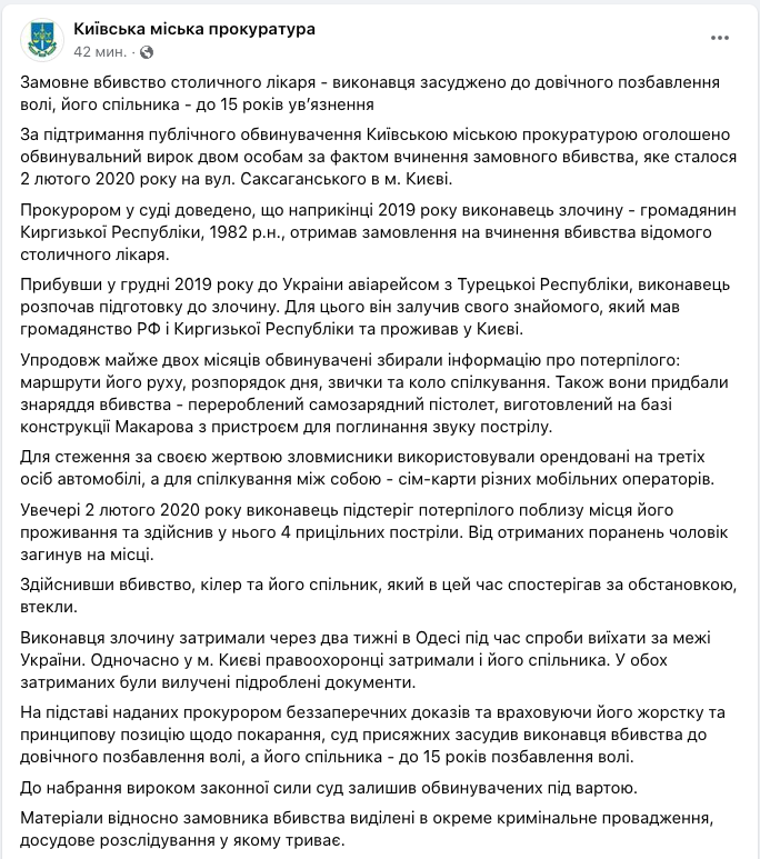 Суд приговорил к пожизненному заключению исполнителя резонансного заказного убийства киевского пластического хирурга. Его сообщник получил 15 лет тюрьмы, а вот о судьбе заказчика ничего не сообщается.