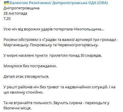Ночью 28 ноября россияне обстреляли из "Градов" и тяжелой артиллерии три громады Днепропетровской области - Марганецкую, Покровскую и Красногригорьевскую.