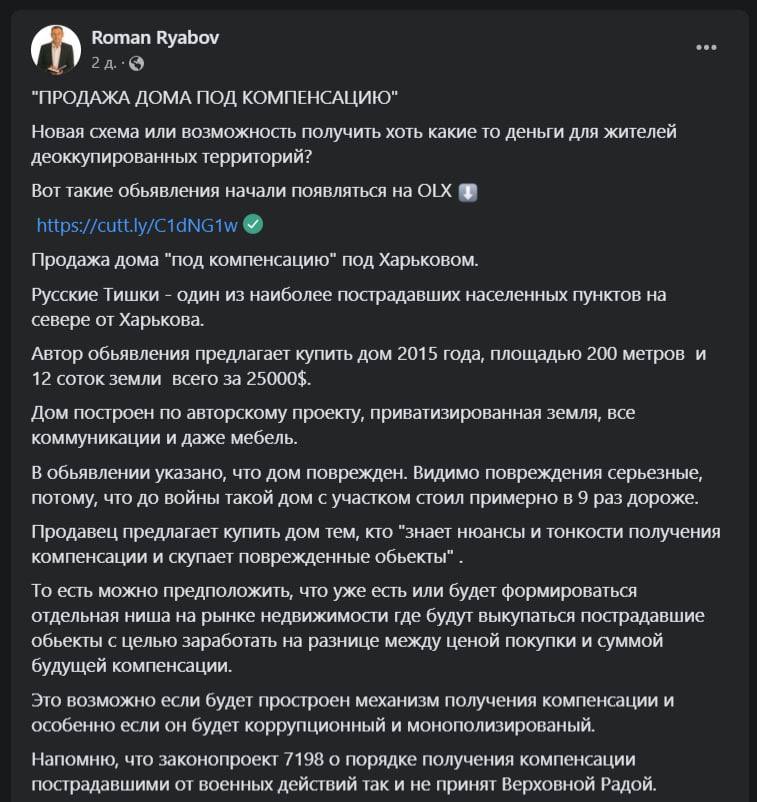 "Видимо, повреждения серьезные, потому что до войны такой дом с участком стоил примерно в 9 раз дороже. Продавец предлагает купить дом тем, кто "знает нюансы и тонкости получения компенсации и скупает поврежденные объекты". То есть можно предположить, что уже есть или будет формироваться отдельная ниша на рынке недвижимости, где будут выкупаться пострадавшие объекты с целью заработать на разнице между ценой покупки и суммой будущей компенсации", - пишет Рябов.