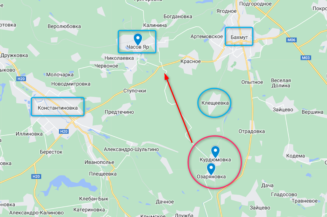 Само по себе занятие этих населенных пунктов не означает окружение Бахмута. Чтобы дойти до самого города и перерезать одну из трасс, которая связывает город с "большой землей" (на Константиновка) россиянам нужно взять еще и Клещеевку, и Красное (находится прямо на трассе).