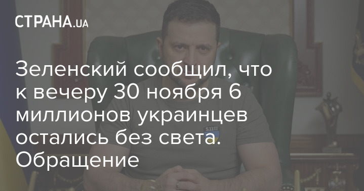 Зеленский сообщил, что к вечеру 30 ноября 6 миллионов украинцев остались без света. Обращение