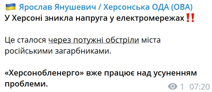 08:21 В Херсоне власти подтвердили отключение света из-за обстрелов, которые произошло этой ночью.