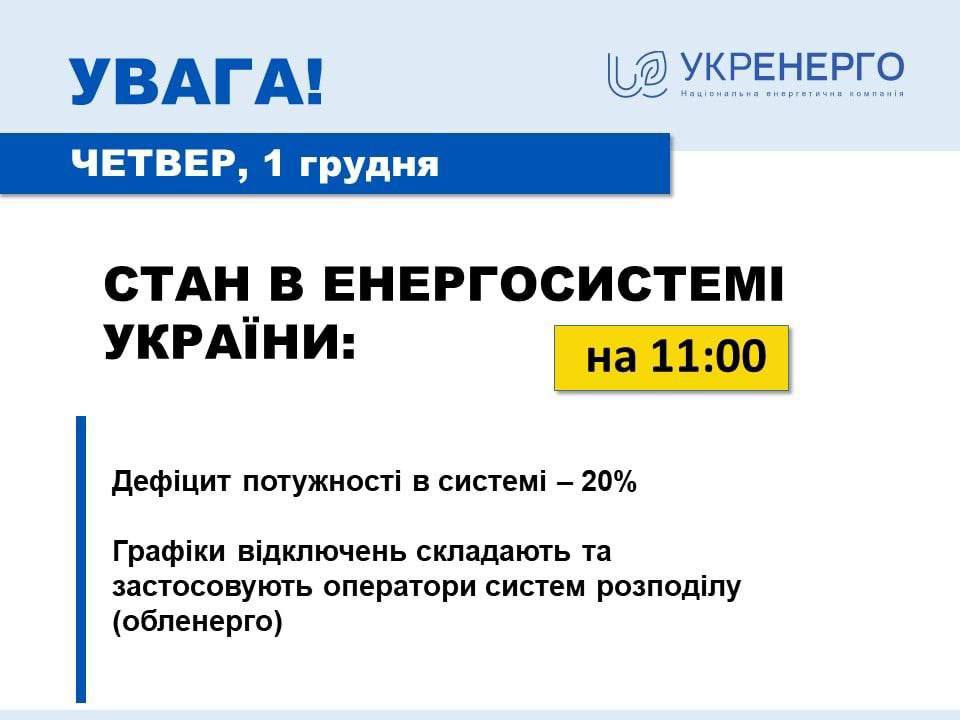 11.35 Укрэнерго в своём телеграмм-канале полчаса назад опубликовало сообщение о состоянии энергосистемы Украины. Из него следовало, что дефицит энергомощностей снизился до 20% (вчера он был 27%).