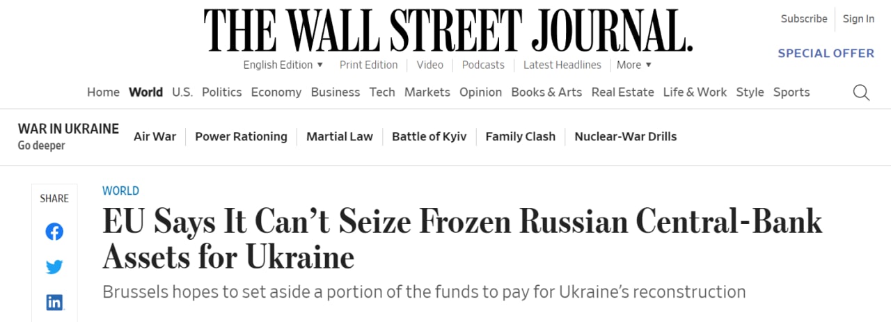 14.20 В ЕС признали, что не могут конфисковать замороженные активы Центробанка РФ из-за действия международного принципа государственного иммунитета, пишет The Wall Street Journal.