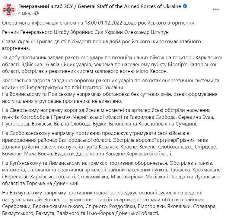 В четверг, 1 декабря, в Украине идет уже 281-й день войны с РФ.