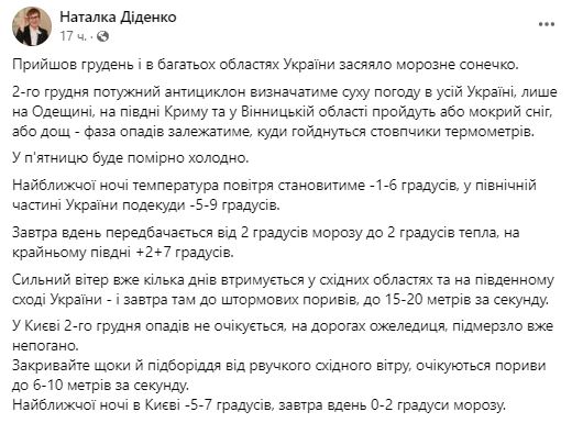 В пятницу, 2 декабря, мощный антициклон определит сухую погоду по всей Украине. Мокрый снег или дождь ожидается только в Одесской области, на юге Крыма и в Винницкой области.