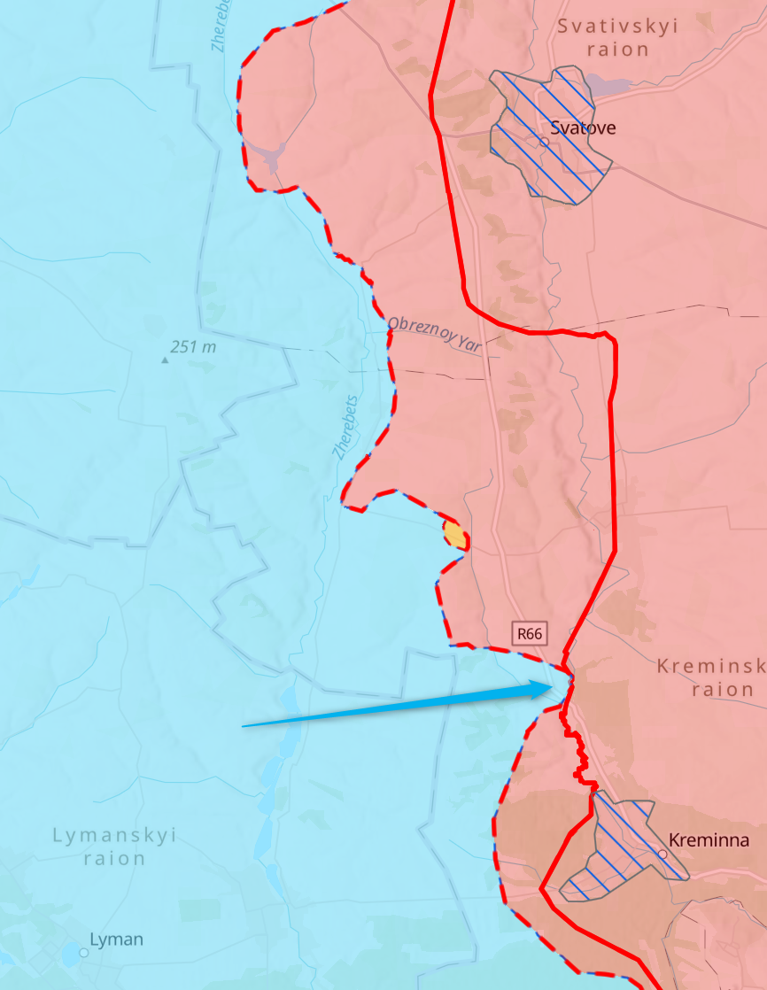На картах Института в зоне украинского контроля обозначено село Червонопоповка на трассе Р66 между Кременной и Сватово. Ранее российские военные блогеры заявляли, что ВСУ вышли на подступы к населенному пункту, но были отброшены российской контратакой.