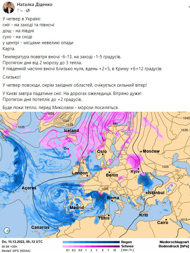 Кроме того, Диденко предупреждает, что в некоторых регионах будет скользко, а также ожидается сильный ветер во всех регионах Украины, кроме западных областей.