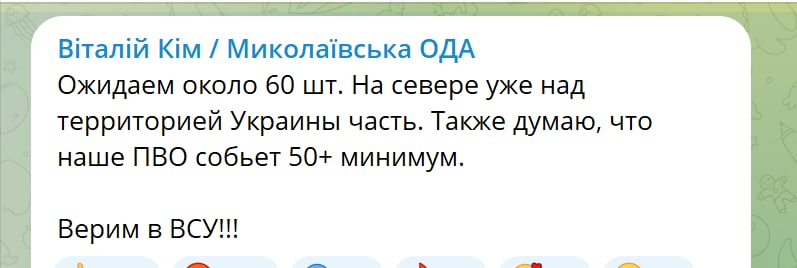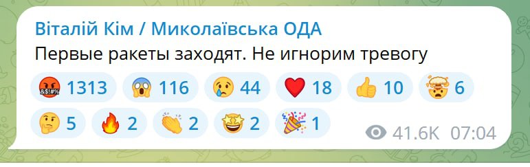 08:23 Губернатор Ким заявил, что ракеты уже вошли в воздушное пространство Украины на севере. Ожидается около 60 снарядов.