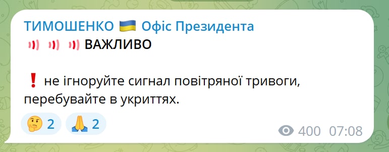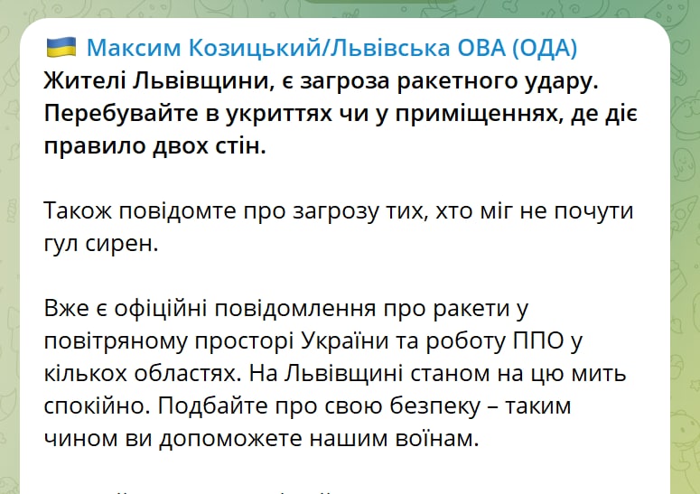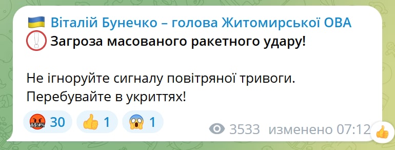 08:17 Губернатор Житомирской области Бунечко пишет об угрозе массированного ракетного удара.