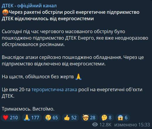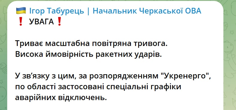 08:38 В Черкасской области тоже превентивно отключают свет, сообщил местный губернатор.