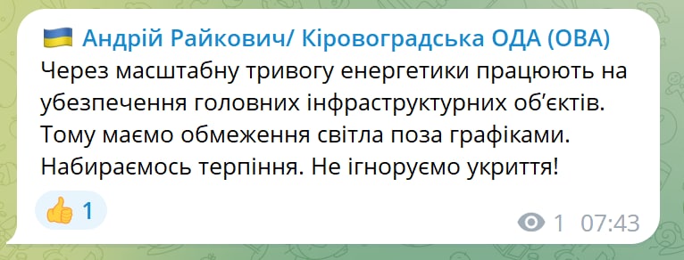 08:44 Свет на случай российских ударов отключают и в Кировоградской области.