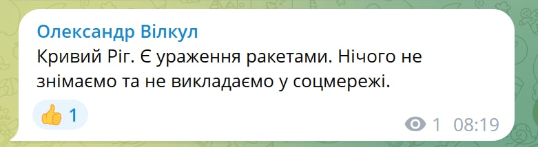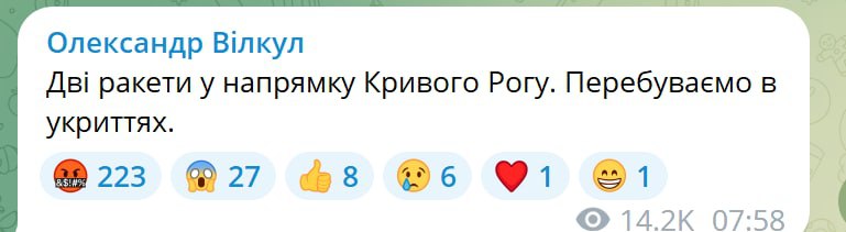 09:01 Две ракеты идут в направлении Кривого Рога, сообщил глава военной администрации Вилкул.