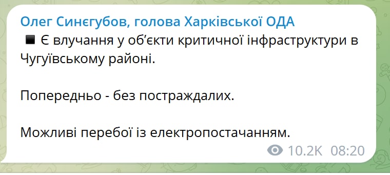 09:07 Мэр Харькова говорит о прилете в инфраструктурный объект и предупреждает о перебоях со светом.