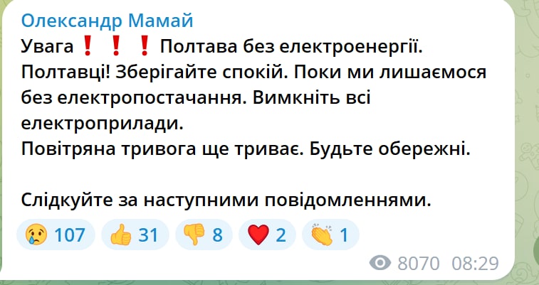 09:35 Вся Полтава осталась без света, сообщил мэр города Александр Мамай.