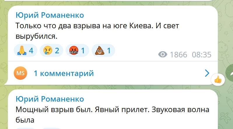 09:38 В Киеве начал пропадать свет (у кого он был). Также слышны прилеты в южной части столицы, пишет политолог Юрий Романенко.