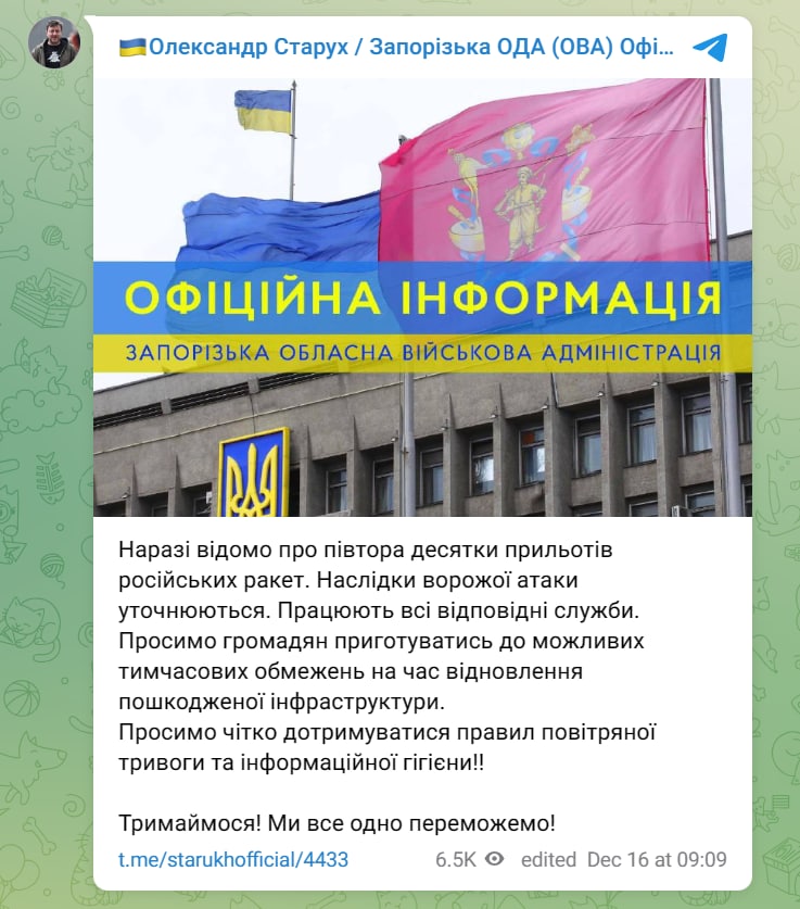 В пятницу, 16 декабря, в Украине идет уже 296-й день войны с РФ.
