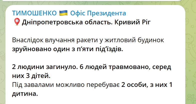 09:40 В Кривом Роге попадание по жилому дому, сообщили в Офисе президента. Под завалами могут быть люди.
