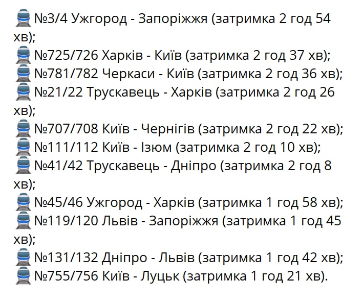 Всего, согласно сообщению, более чем на 30 минут опаздывают 22 поезда.