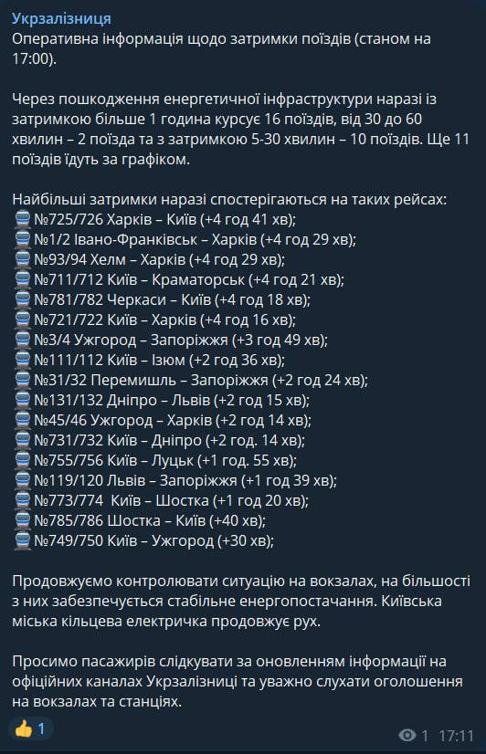 09:42 Ряд участков железной дороги обесточены из-за российских ударов по объектам энергетики, сообщает "Укрзализныця".