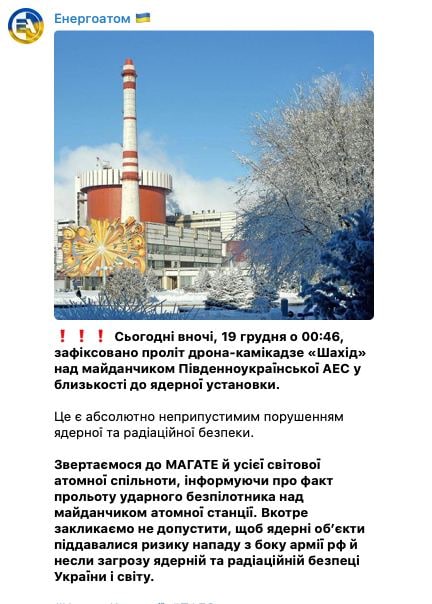 14.30 Энергоатом заявляет, что во время ночной атаки дронами один "Шахид" пролетел над площадкой Южноукраинской АЭС недалеко от ядерной установки.