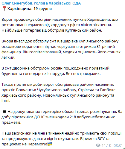 "Больше всего страдает от обстрелов Купянский район. Вчера в результате обстрела пгт Ковшаровка Купянского района осколочное ранение во время дежурства получил 31-летний фельдшер. Он госпитализирован, медики оценивают его состояние как легкое", - написал Синегубов в своем телеграмм-канале.