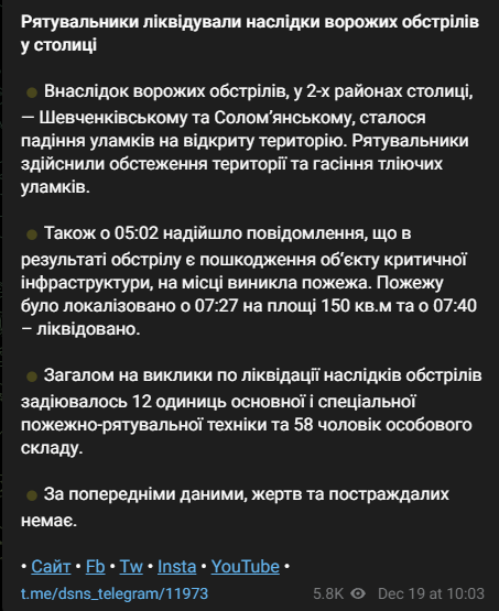 "Также, в 05:02 поступило сообщение, что в результате обстрела есть повреждение объекта критической инфраструктуры, на месте возник пожар. Пожар был локализован в 07:27 на площади 150 кв.м и в 07:40 – ликвидирован", - говорится в сообщении.