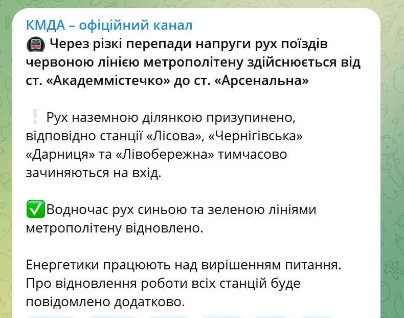 Телеграм-каналы Киева с утра пишут о мощных скачках напряжения на Левом берегу и проблемах с движением в метро.