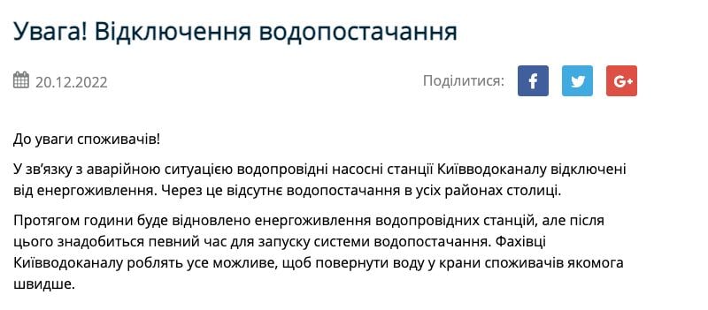 Специалисты уже работают над запуском системы, но КГГА предупреждает, что в первой половине дня в столице возможны перебои с водоснабжением.