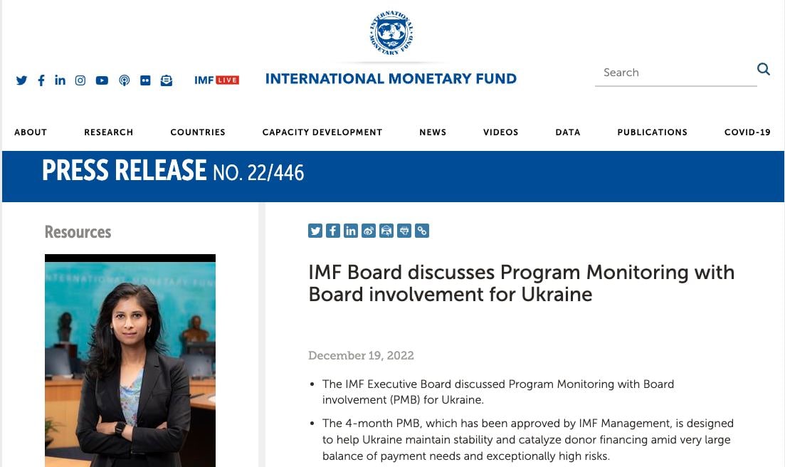 По оценке МВФ, в 2023 году Украине потребуется от 40 до 57 миллиардов долларов США внешнего финансирования для сохранение экономической стабильности в условиях войны.