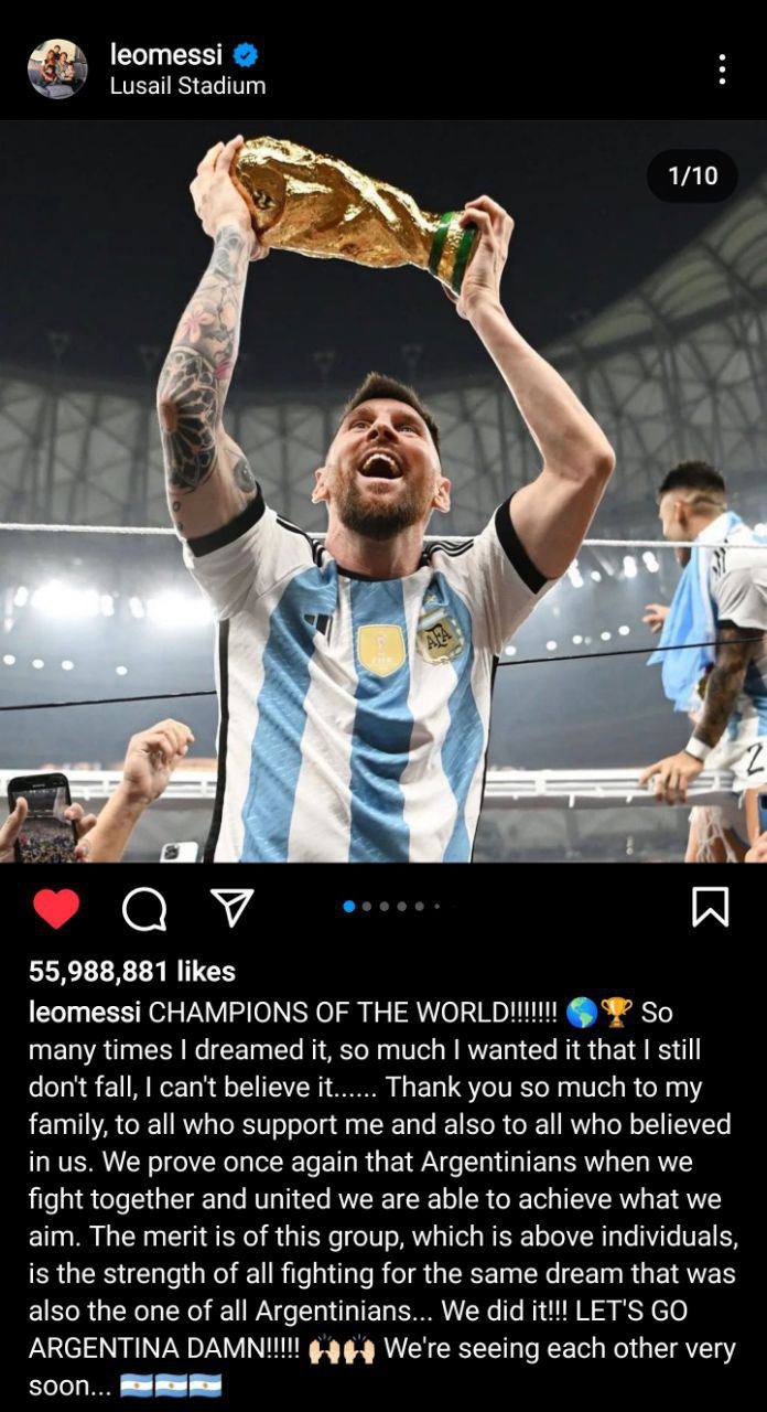Пост Месси с кубком мира по футболу собрал более 55 млн лайков и стал самым популярным в истории Instagram.