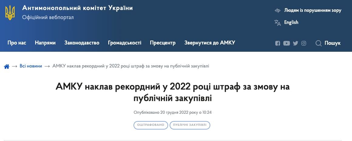 Сообщается, что АМКУ наложил рекордный в 2022 году штраф за сговор на публичной закупке.