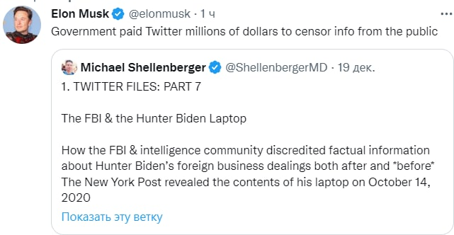 Twitter в последние недели публикует внутреннюю документацию, из которой следует, что в преддверии президентских выборов 2020 года тогдашние собственники во взаимодействии с представителями властей ограничивали распространение сведений о скандальном содержании ноутбука, потерянного сыном президента США Хантером Байденом.