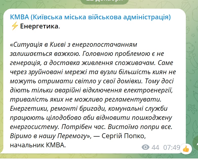 "Главной проблемой является не генерация, а доставка питания потребителям. Именно из-за разрушенных сетей и узлов большинство киевлян не могут получить свет в свои дома. Поэтому до сих пор действуют только аварийные отключения электроэнергии, длительность которых невозможно регламентировать", – заявил глава КГВА Сергей Попко.