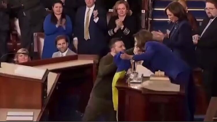 Спикер Конгресса США Нэнси Пелоси поцеловала руку президента Украины Владимира Зеленского, когда он передавал ей украинский флаг из Бахмута.