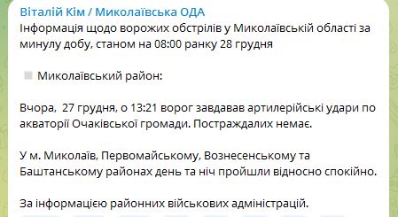 26 декабря, в результате огневого поражения позиций противника в районе Чаплинки Херсонской области, потери оккупантов составили около 50 военнослужащих погибшими.