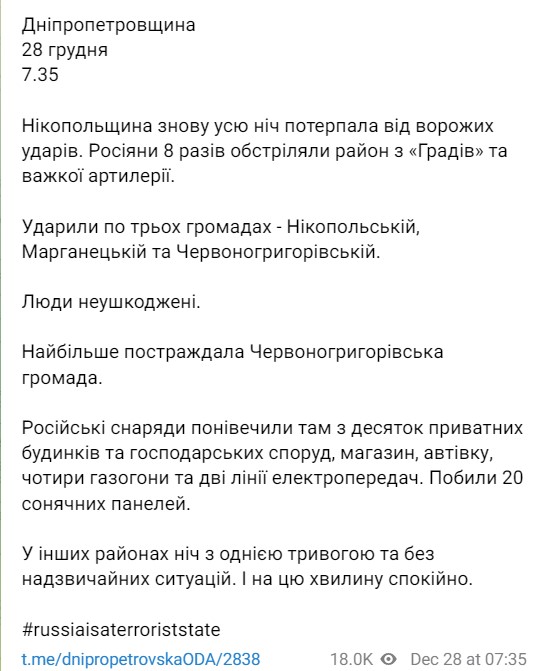 Ночью 28 декабря россияне 8 раз обстреляли из "Ураганов", "Градов" и тяжелой артиллерии Никопольский район Днепропетровской области.