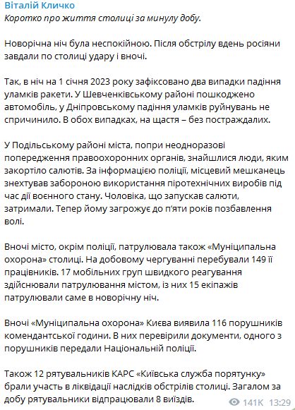 В ночь на 1 января 2023 года войска РФ нанесли по столице удар, зафиксировано два случая падения обломков ракеты. В Шевченковском районе поврежден автомобиль, в Днепровском падение обломков разрушений не повлекло. В обоих случаях обошлось без пострадавших.