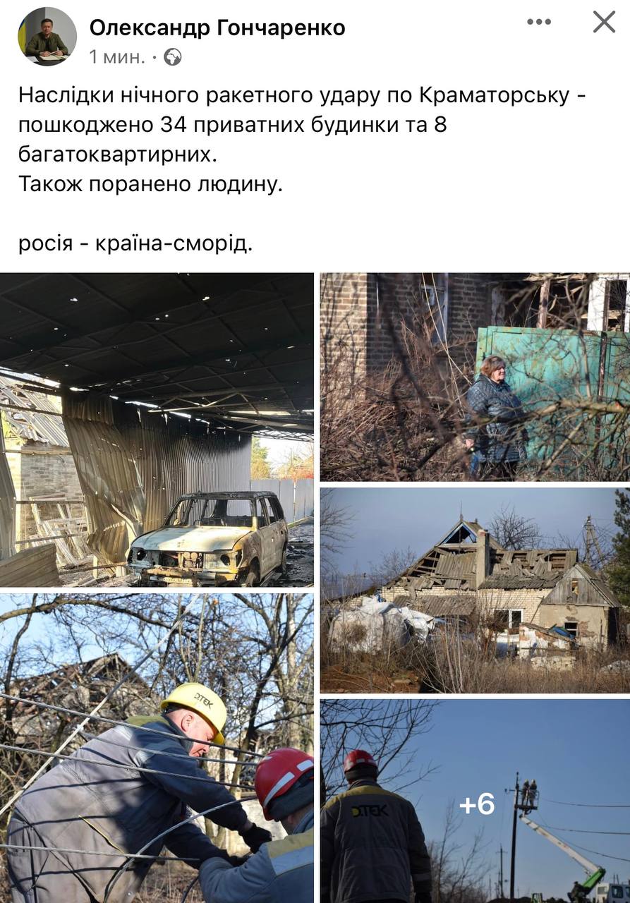Мэр Краматорска Александр Гончаренко у себя на странице в Facebook рассказал о последствиях ночного ракетного удара, который попал в прямой эфир французского телеканала.