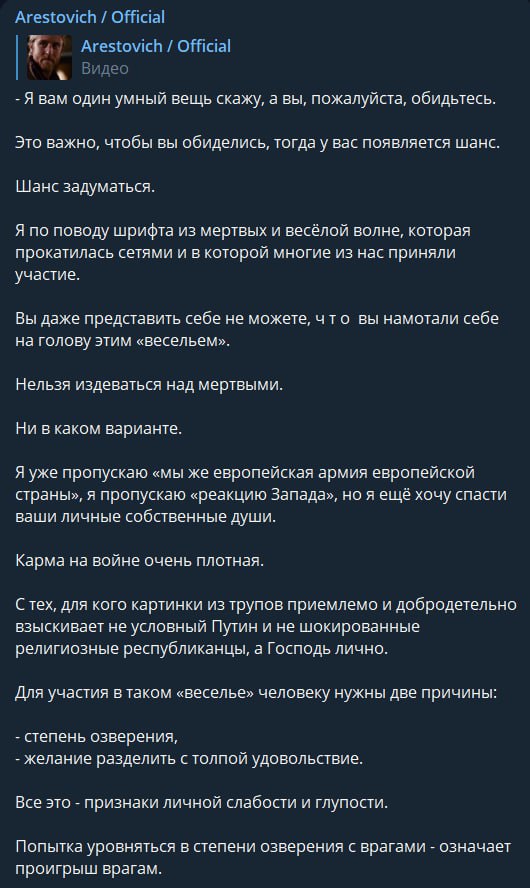 "Я ещё хочу спасти ваши личные собственные души. Карма на войне очень плотная", - пишет Арестович.