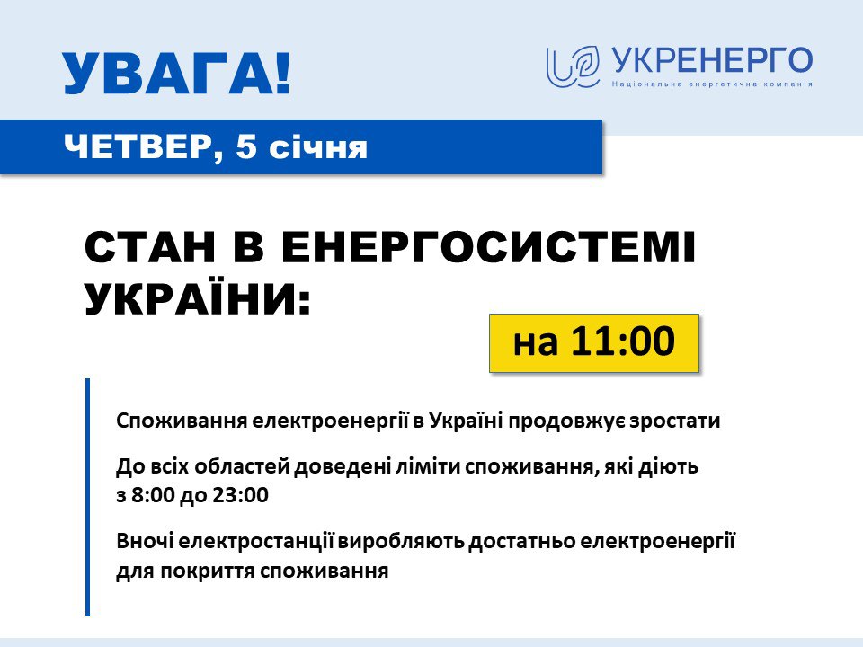 В Украине 5 января продолжает расти потребление электроэнергии из-за постепенного снижения температуры и активизации работы промышленности и бизнеса. До всех областей Украины доведены лимиты потребления, действующие с 8:00 до 23:00.