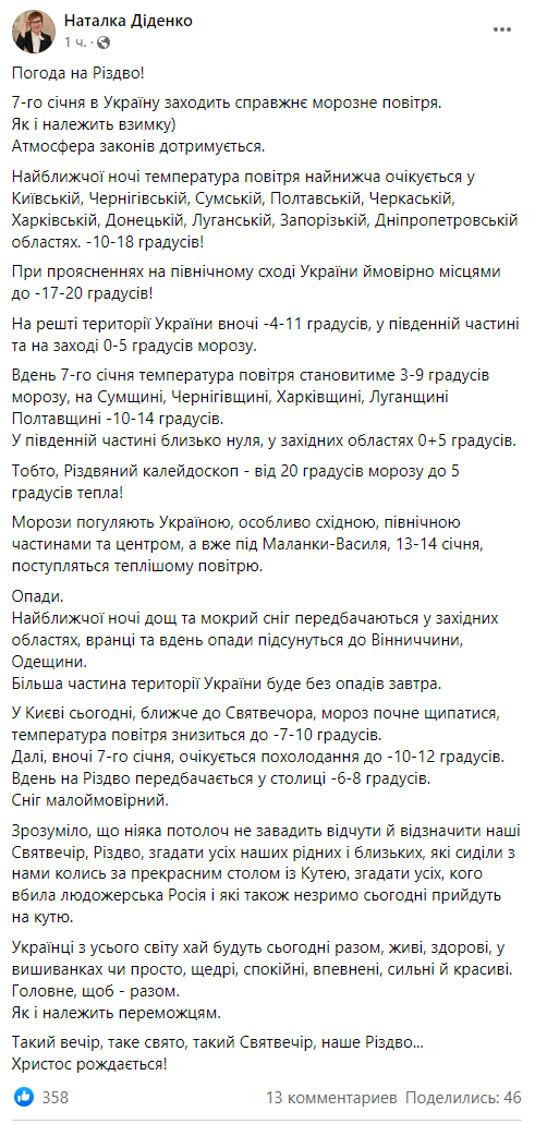 Ночные морозы до -20 и мокрый снег в западных областях. Синоптик рассказала о погоде в Украине на Рождество