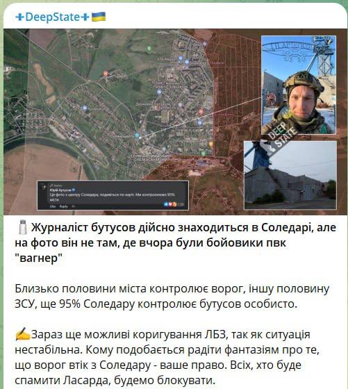 В тоже время, по данным проекта DeepState, ВСУ контролируют около половины города, а другую половину - россияне. Также DeepState отмечает, что Бутусов действительно находится в Соледаре, но фото его сделано не там, где вчера были "вагнеровцы".