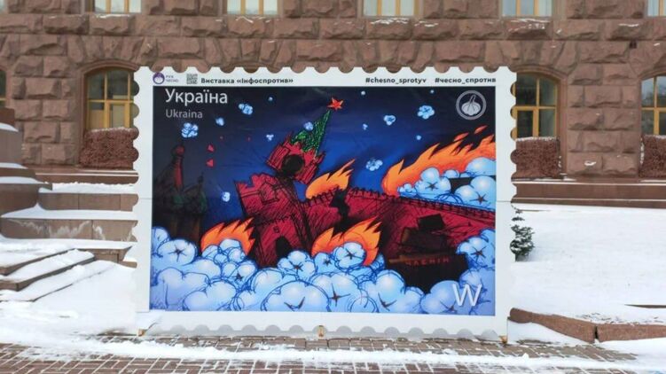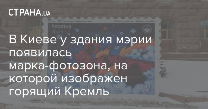 В Киеве рядом со зданием КГГА установили новую марку-фотозону с горящим московским Кремлем. Она называется "Хлопок над Кремлем".