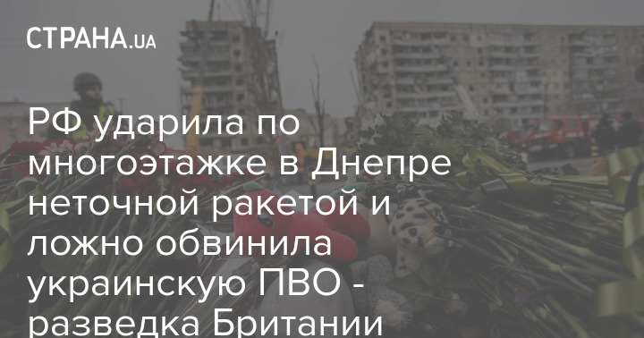 "Большая противокорабельная ракета AS-4 Kitchen (Х-22 - Ред.), запущенная со среднего бомбардировщика Ту-22М3, с высокой долей вероятности поразила жилой дом в Днепре, в результате чего погибло не менее 40 человек. Россия ложно предположила, что виновата украинская ракета ПВО", - сообщает британская разведка.